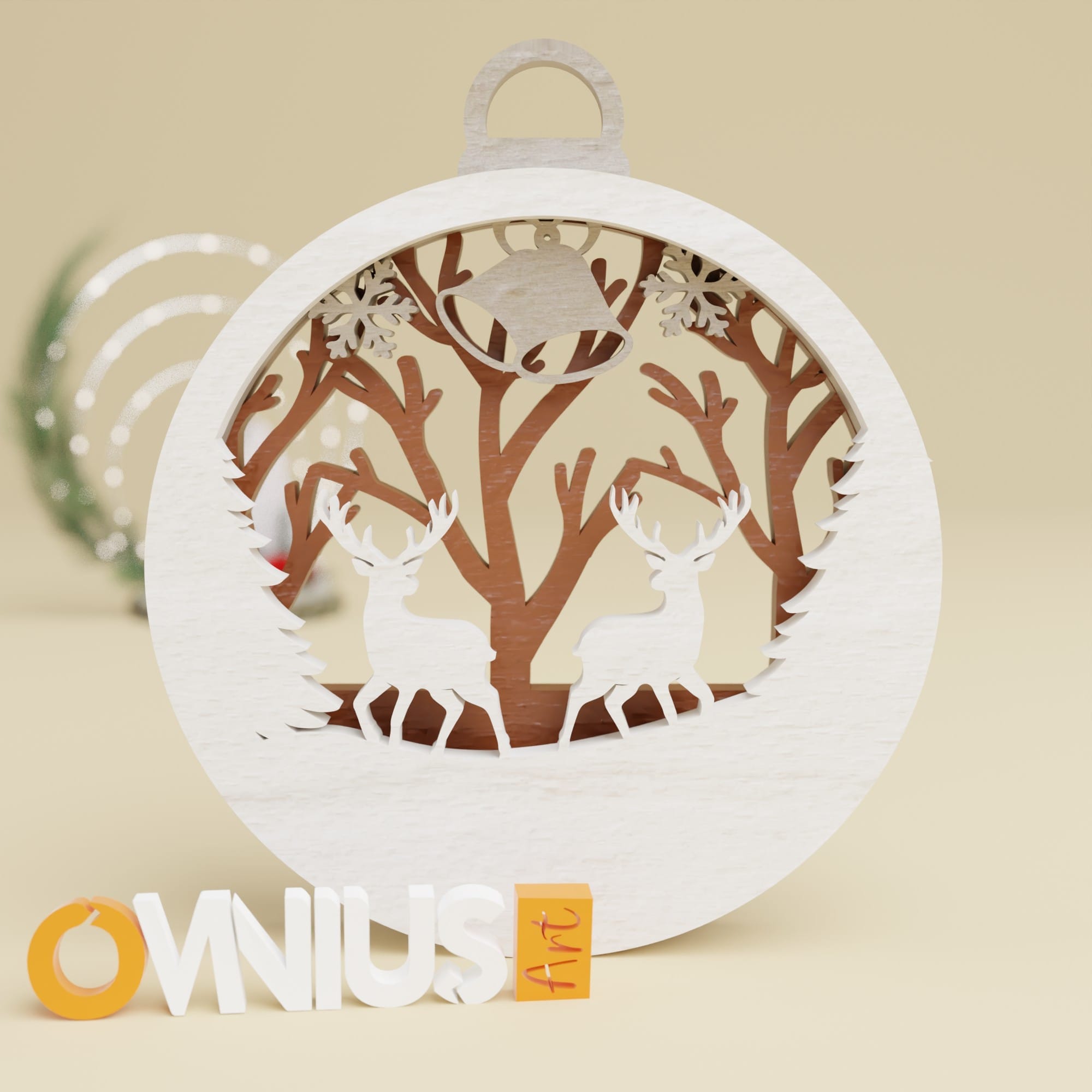 Tražite li savršeni ukras za Božić? Naša kuglica za bor dva jelena i borovi koja slavi ljepotu zimske prirode stvara simetričan prizor u tri sloja. Gornji sloj prikazuje dva jelena i dva bora sa strane, dok su u sredini zvonce i pahuljice. Zadnji sloj s drvima bez lišća dočarava šumsku idilu.