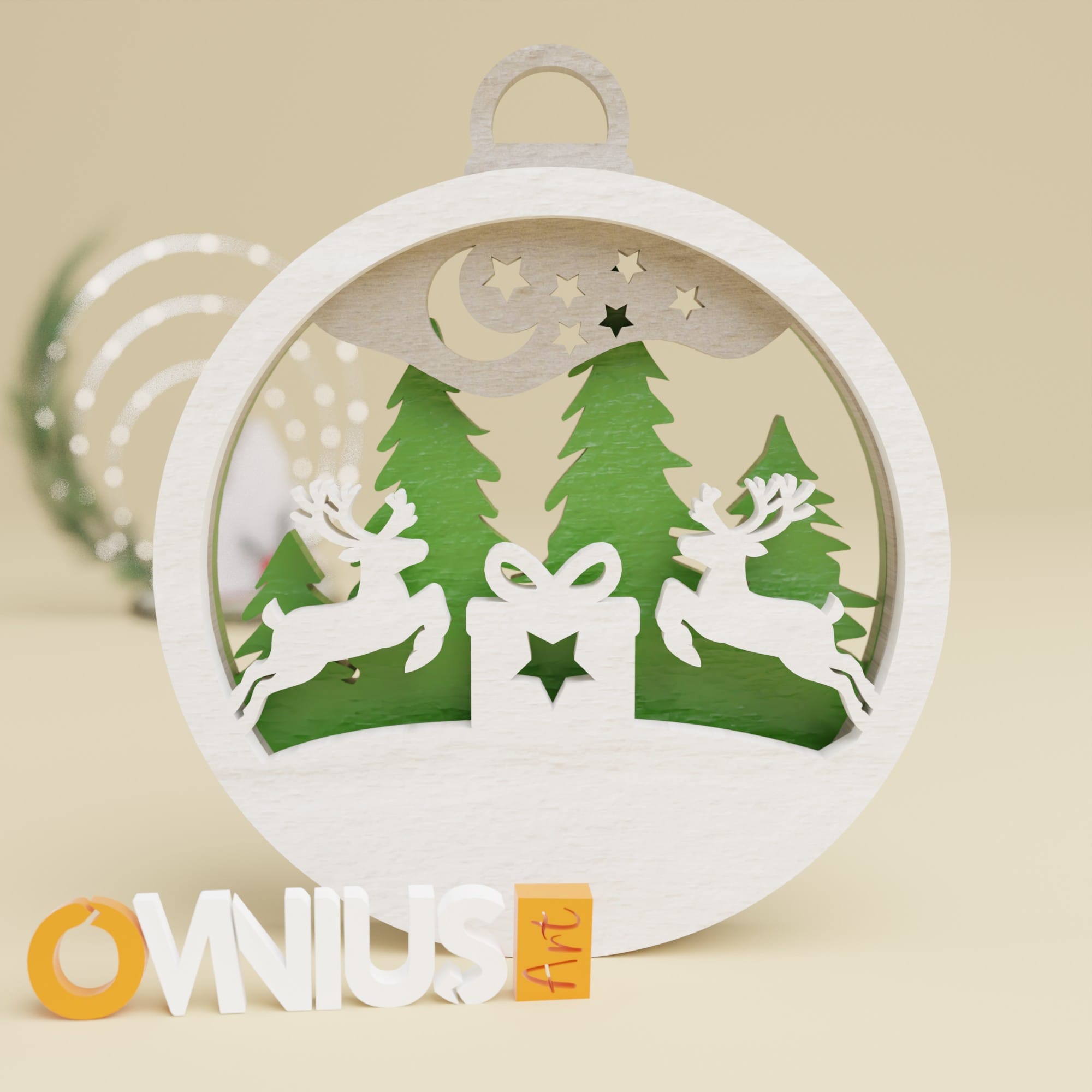 Tražite li savršeni ukras za Božić? Naša kuglica za bor dva soba i poklon koja slavi duh darivanja stvara bogat prizor u tri sloja. Gornji sloj prikazuje poklon s dva soba, dok su u sredini mjesec i zvijezdice. Zadnji sloj s borovom šumom naglašava osjećaj blagdanske čarolije.