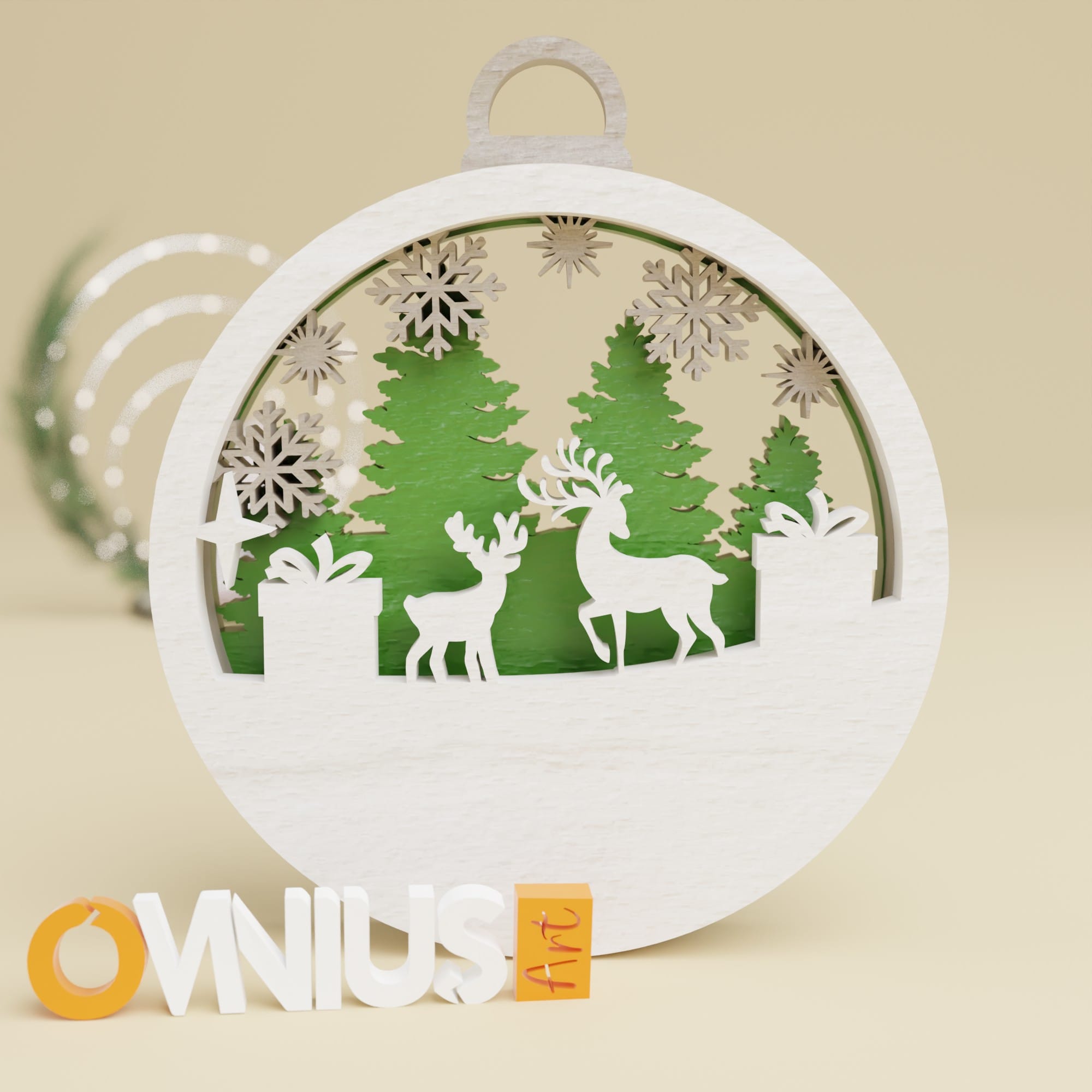Tražite li savršeni ukras za Božić? Naša kuglica za bor dva soba i zvijezda koja slavi darivanje stvara bogat prizor u tri sloja. Gornji sloj prikazuje dva soba, dva poklona i zvijezdu sjevernjaču, dok su u sredini pahuljice. Zadnji sloj s borovom šumom naglašava osjećaj putovanja i darivanja u snježnoj noći.