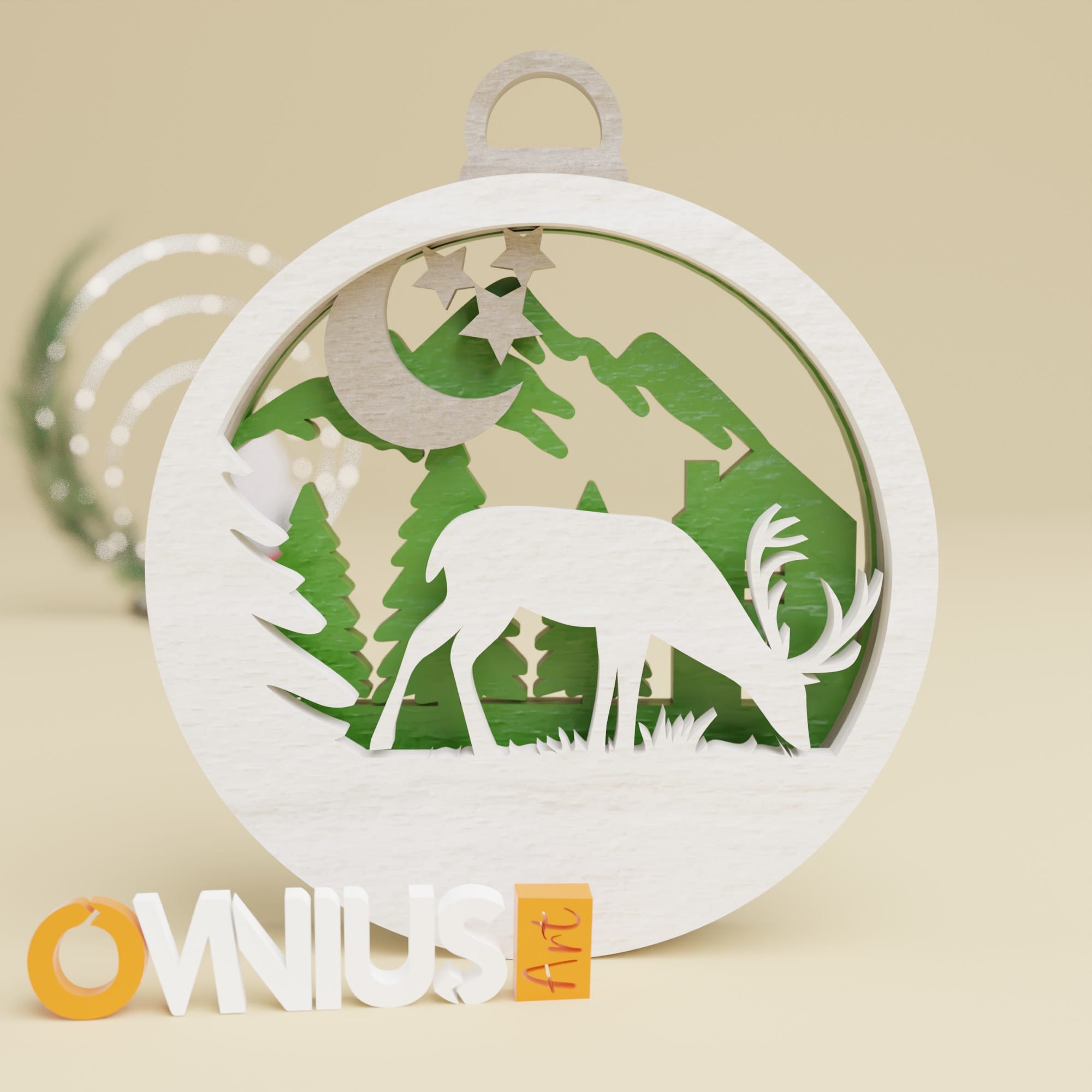 Tražite li savršeni ukras za Božić? Naša kuglica za bor jelen koja odiše zimskom elegancijom stvara idiličan prizor prirode u tri sloja. Gornji sloj prikazuje siluetu jelena, dok su u sredini mjesec i zvijezde. U pozadini se nalaze siluete kuća i planina, stvarajući dojam snježne divljine.