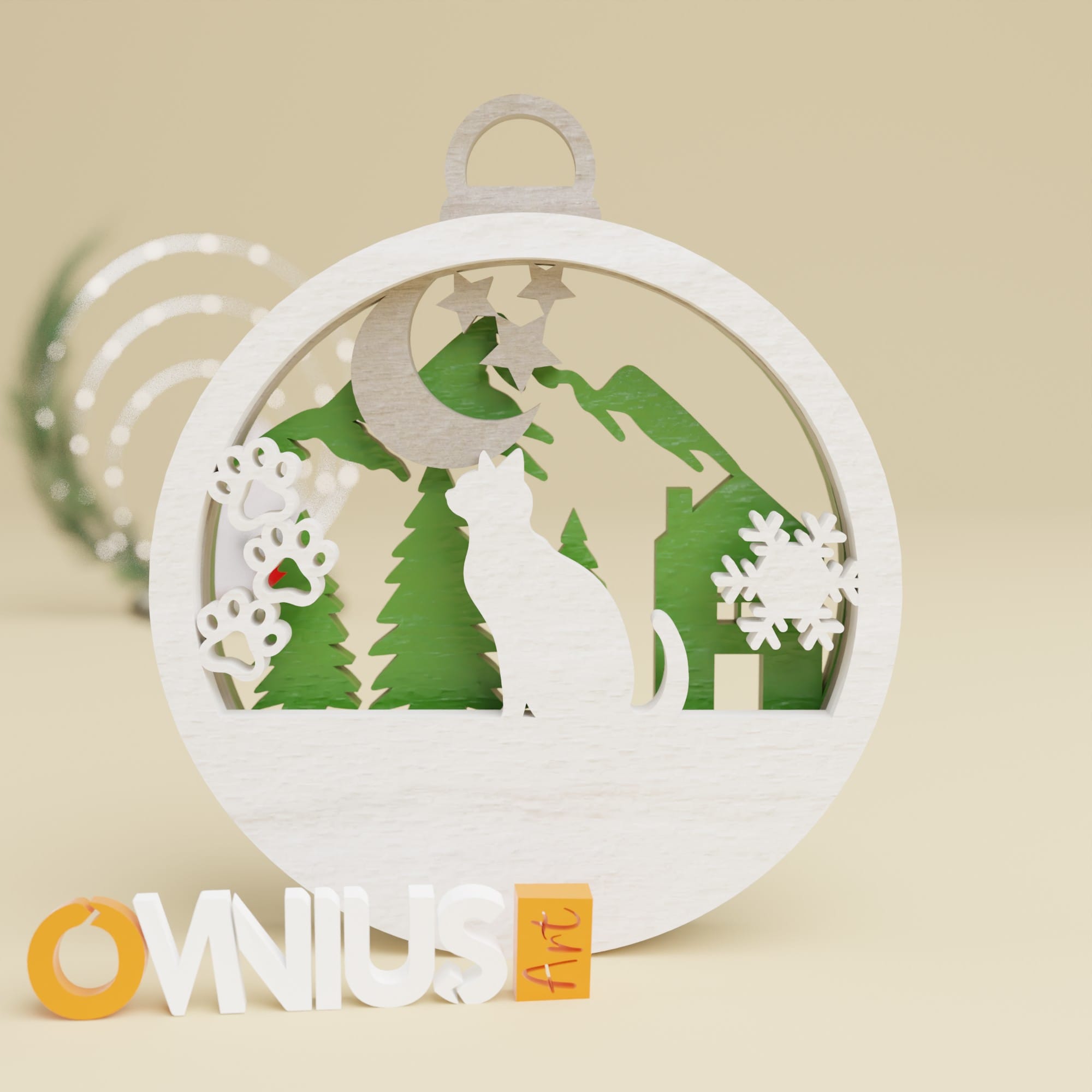 Tražite li savršeni ukras za Božić? Naša kuglica za bor mačka i šape koja će unijeti dašak nježnosti u vaš dom stvara dirljiv prizor u tri sloja. Gornji sloj prikazuje mačku i otiske njenih šapa, uz dodatak pahuljice, dok su u sredini mjesec i zvijezde. Silueta kuća i planina u pozadini daje dojam mirne zimske noći.