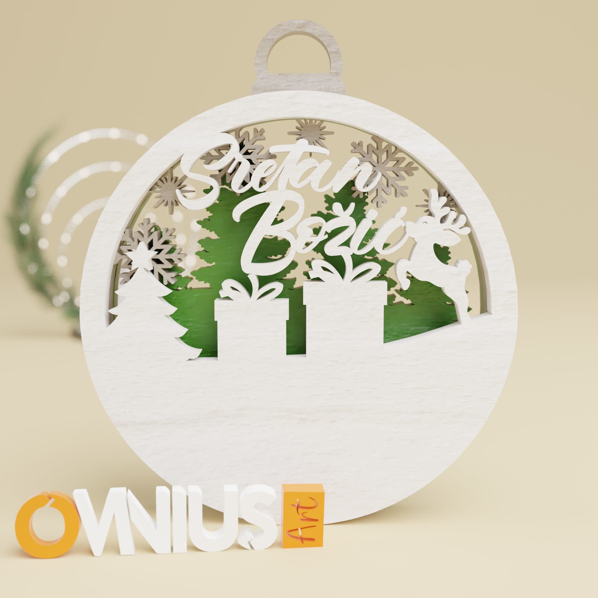 Tražite li savršeni ukras za Božić? Naša kuglica za bor pokloni i sob koja je puna blagdanske radosti stvara dinamičan prizor u tri sloja. Gornji sloj prikazuje poklone, veselog soba, bor sa zvijezdom i natpis “Sretan Božić”, dok su u sredini pahuljice. Zadnji sloj s borovom šumom naglašava osjećaj blagdanskog iznenađenja.
