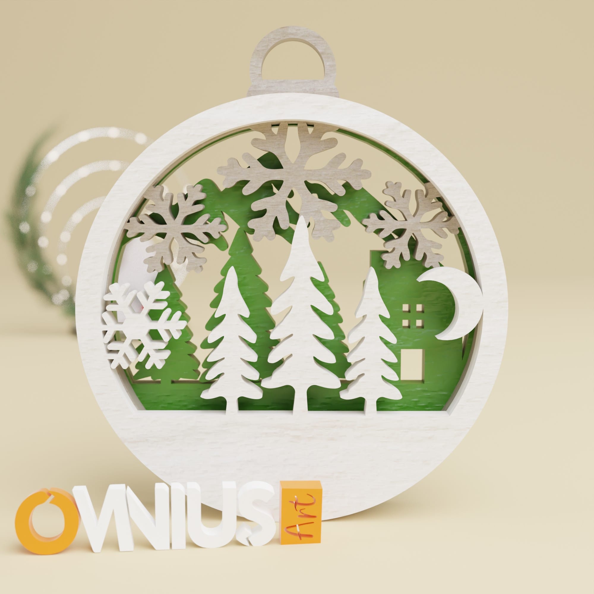 Jednostavnost zimske idile! Ova kuglica za bor snježni borovi izrađena je od tri sloja šperploče ukupne debljine 12 mm, široka je cca 8 cm i dolazi s ukrasnom špagom. Savršen je drveni ukras za vaš bor.
