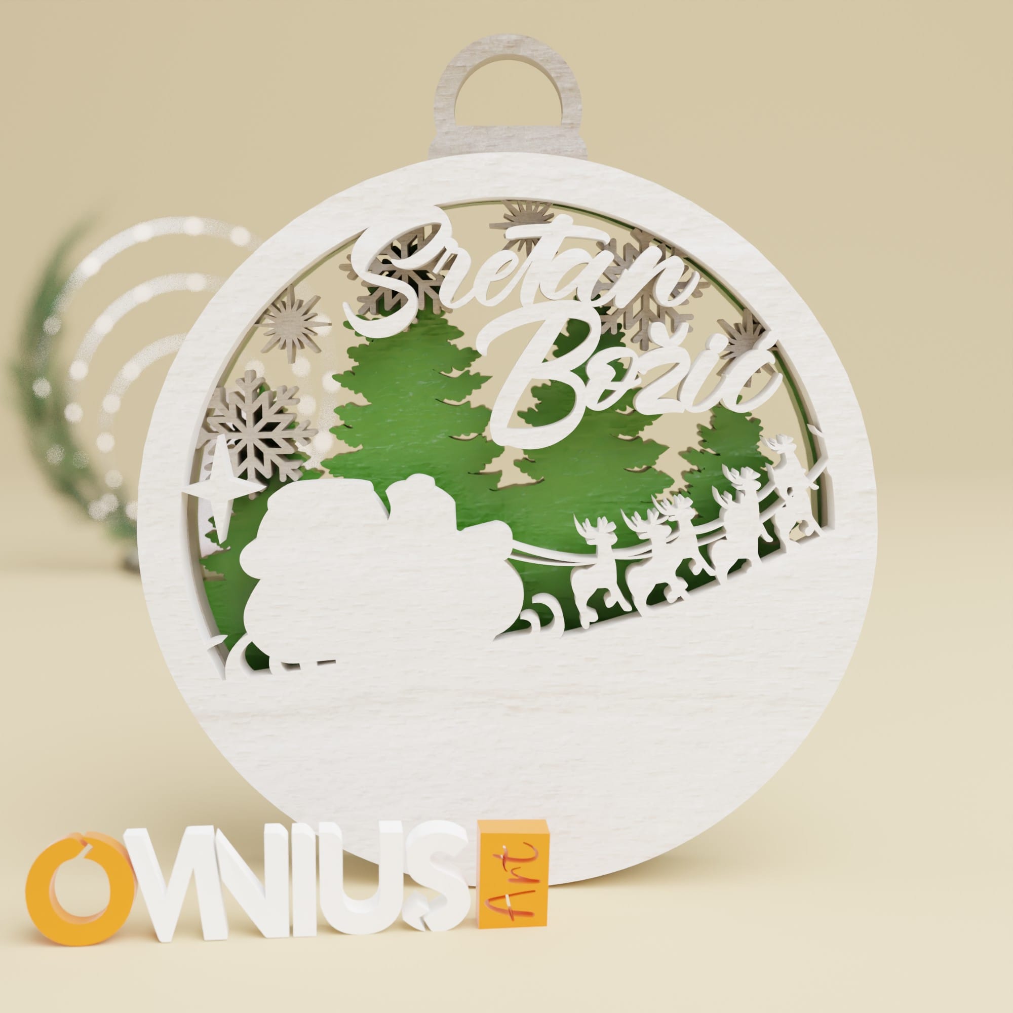 Tražite li savršeni ukras za Božić? Naša kuglica za bor sobovi i Sretan Božić koja prenosi najljepšu čestitku stvara dinamičan prizor u tri sloja. Gornji sloj prikazuje Djeda Mraza kojeg vuku sobovi, uz natpis “Sretan Božić”, dok su u sredini pahuljice. Zadnji sloj s borovom šumom naglašava putovanje kroz snijegom prekriven pejzaž.