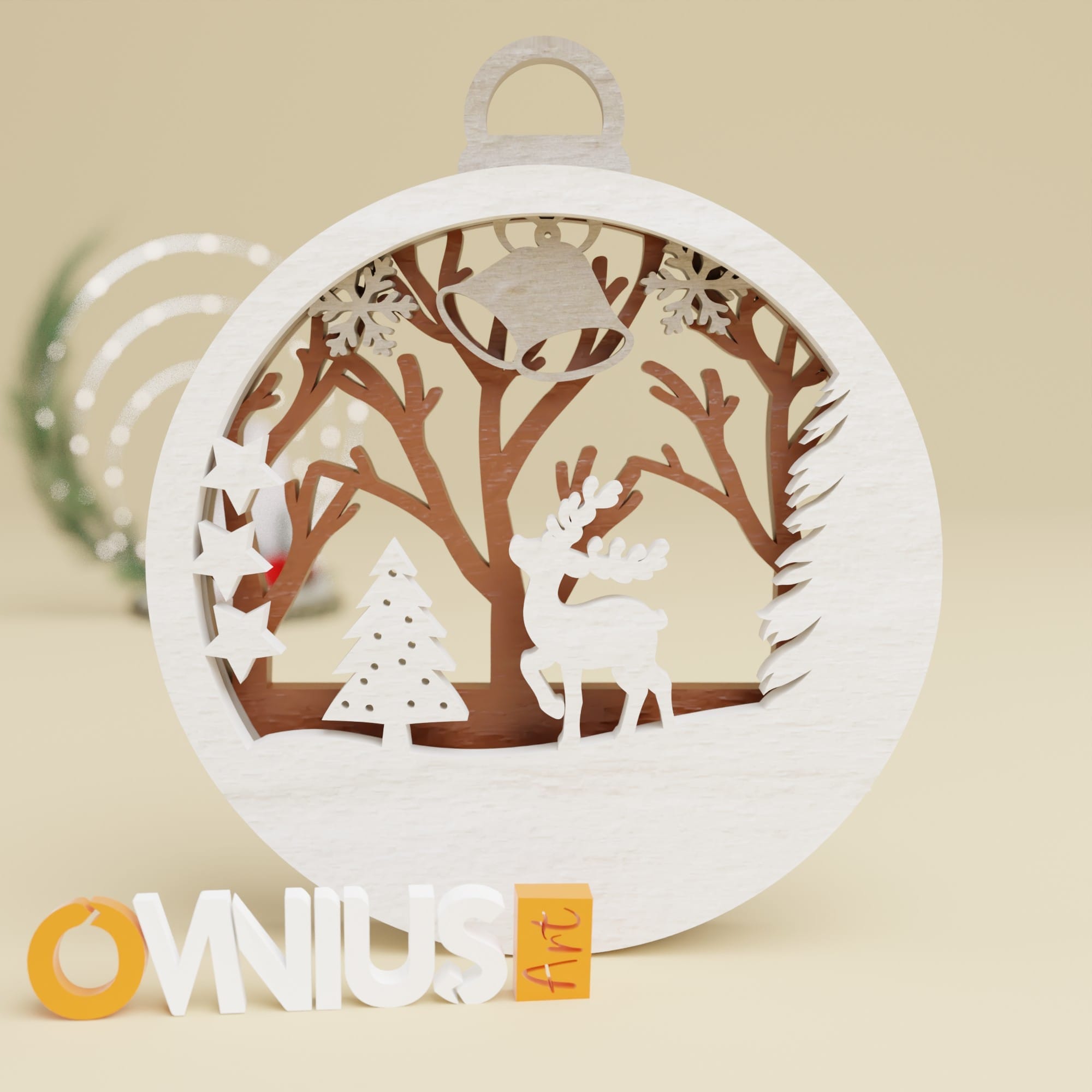 Tražite li savršeni ukras za Božić? Naša kuglica za bor veseli sob i bor koja unosi razigranost stvara vedar prizor u tri sloja. Gornji sloj prikazuje veselog soba, drvo bora i tri zvjezdice, dok su u sredini zvonce i pahuljice. Zadnji sloj s drvima bez lišća dočarava šumsko veselje.