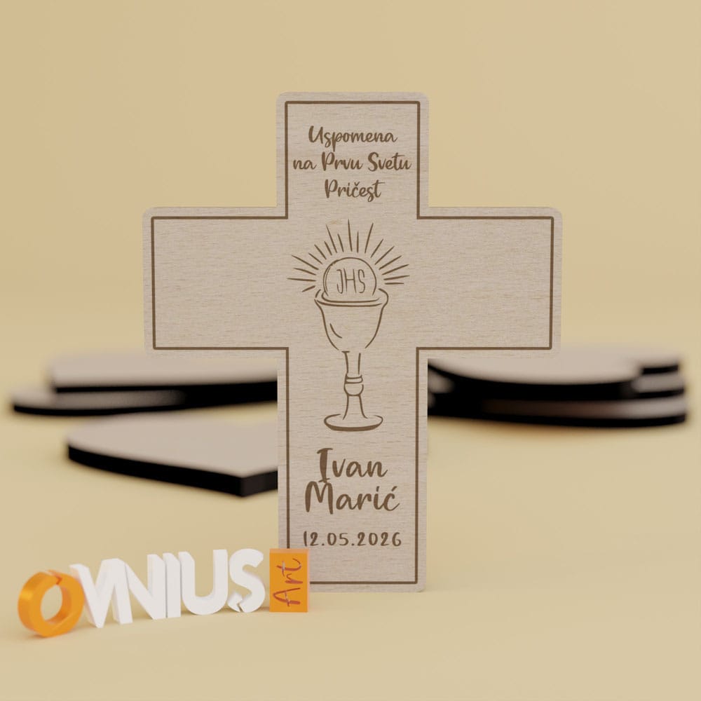 Uspomena koja traje! Ova drvena magnet zahvalnica za Pričest drveni križ s kaležom izrađen je od kvalitetne šperploče s preciznom gravurom za Prvu pričest. Dimenzija je cca 7×6 cm, dolazi s personaliziranim podacima i snažnim magnetom. Savršen znak pažnje za vaše goste.