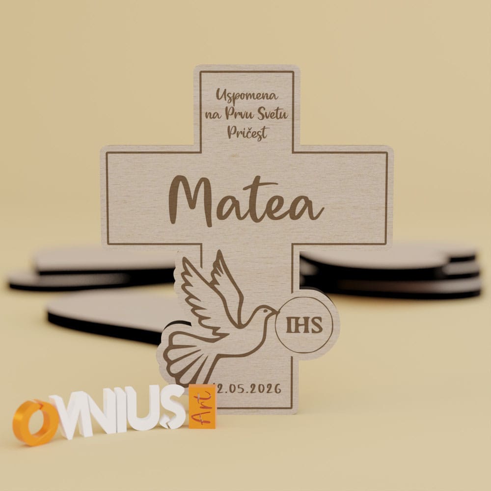 Uspomena koja traje! Ova drvena magnet zahvalnica za Pričest križ golub s hostijom IHS izrađen je od kvalitetne šperploče s preciznom gravurom za Prvu pričest. Dimenzija je cca 7×6 cm, dolazi s personaliziranim podacima i snažnim magnetom. Savršen znak pažnje za vaše goste.