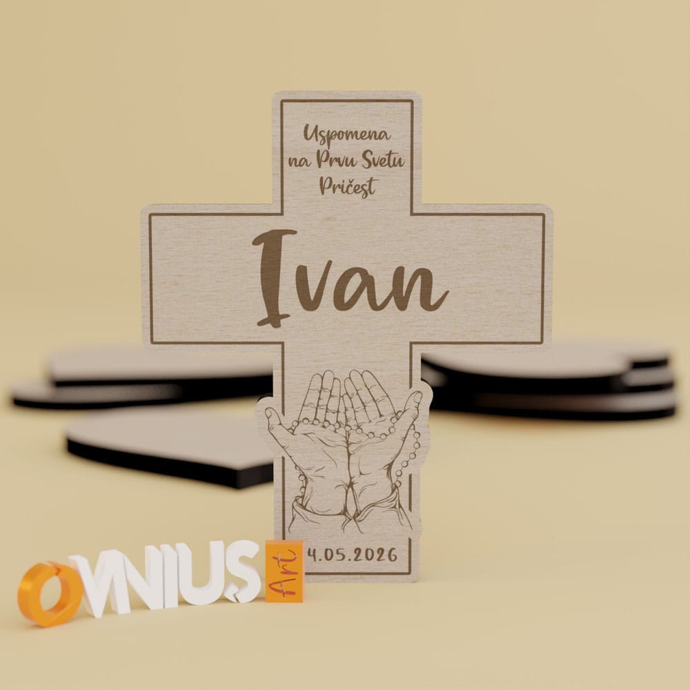 Uspomena koja traje! Ova zahvalnica za pričest ruke krunica izrađen je od kvalitetne šperploče s preciznom gravurom za Prvu pričest. Dimenzija je cca 7×6 cm, dolazi s personaliziranim podacima i snažnim magnetom. Savršen znak pažnje za vaše goste.