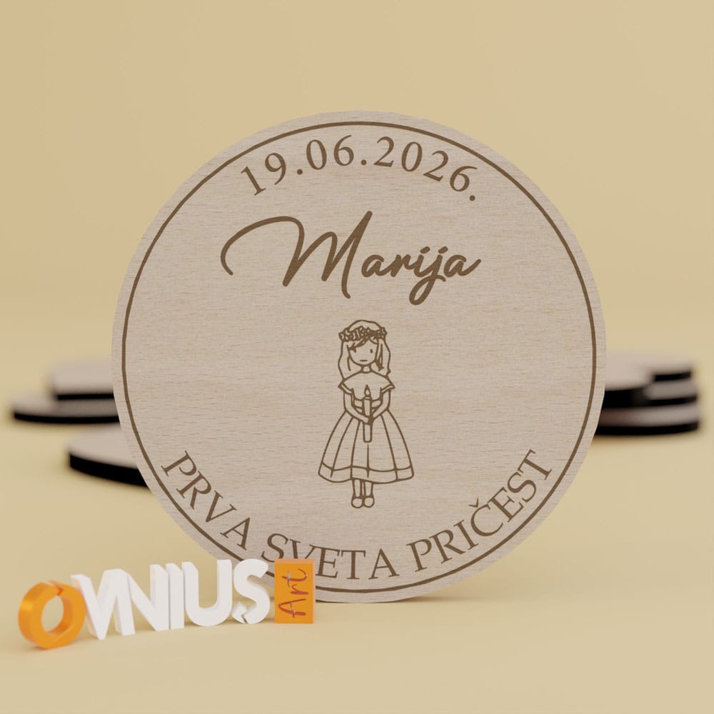 Uspomena koja traje! Ova zahvalnica za pričest za djevojčice izrađena je od kvalitetne šperploče s preciznom gravurom za Prvu pričest. Dimenzija je cca 7×7 cm, dolazi s personaliziranim podacima i snažnim magnetom. Savršen znak pažnje za vaše goste.