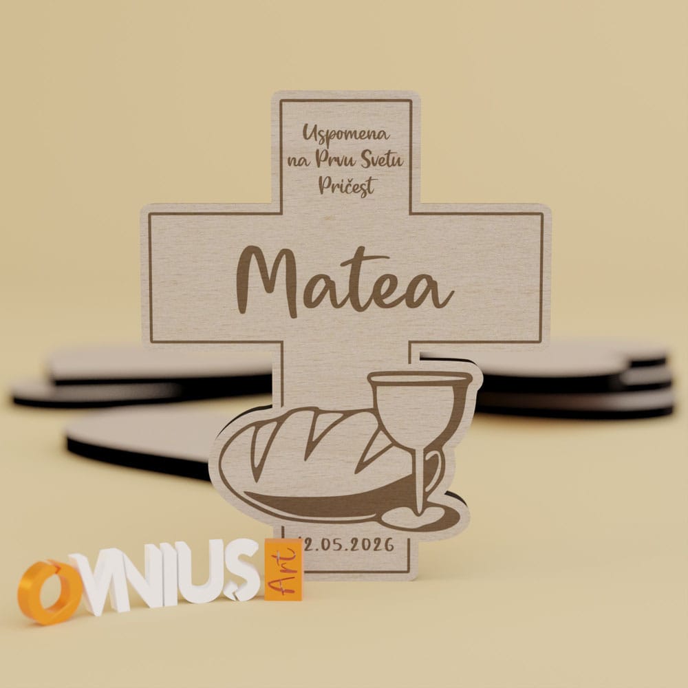 Ova zahvalnica za prvu pričest idealno se kombinira s ostalim dekoracijama. Drvo kao prirodan materijal simbolizira čistoću i trajnost, što ga čini savršenim izborom za dugotrajnim poklonom koji će dugo sjećati na ovaj događaj.