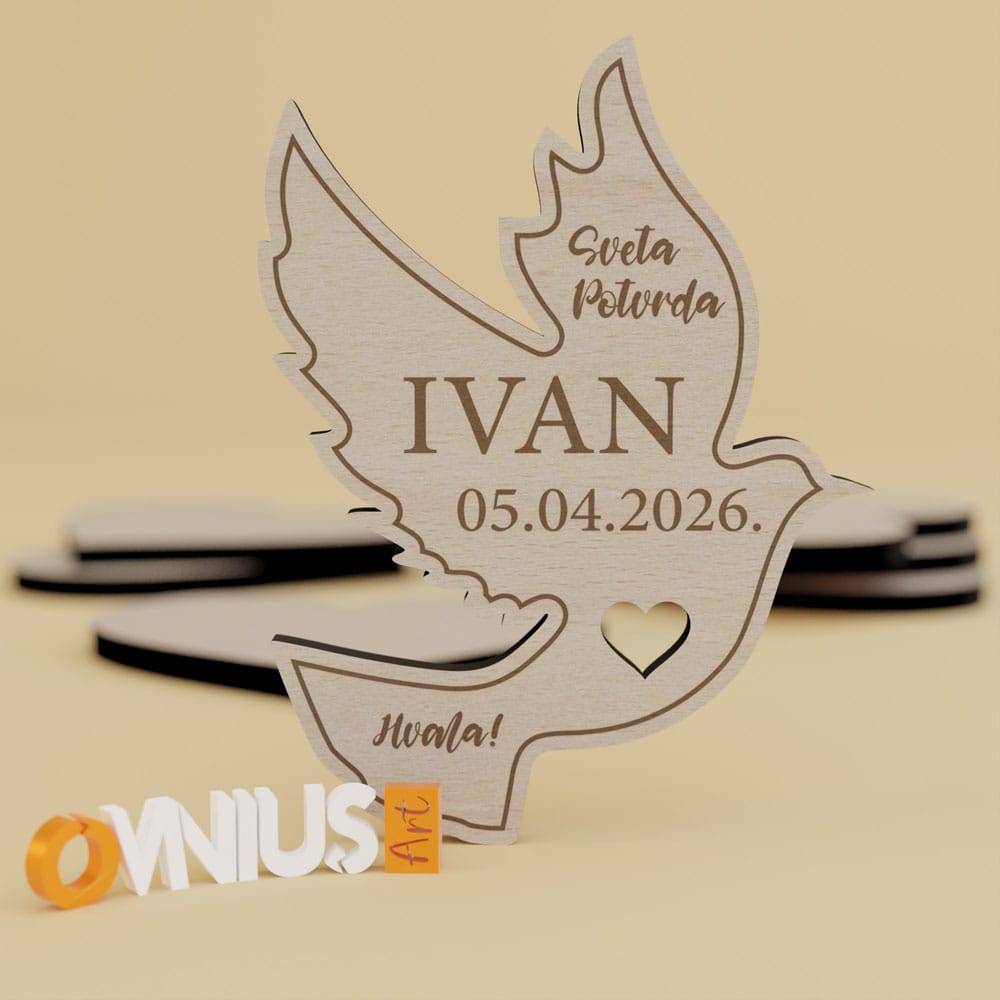 Izrađena je od premium drveta bukve s precizno ugraviranim imenom djeteta i datumom. Prorezano srce na tijelu goluba daje moderan vizualni identitet.