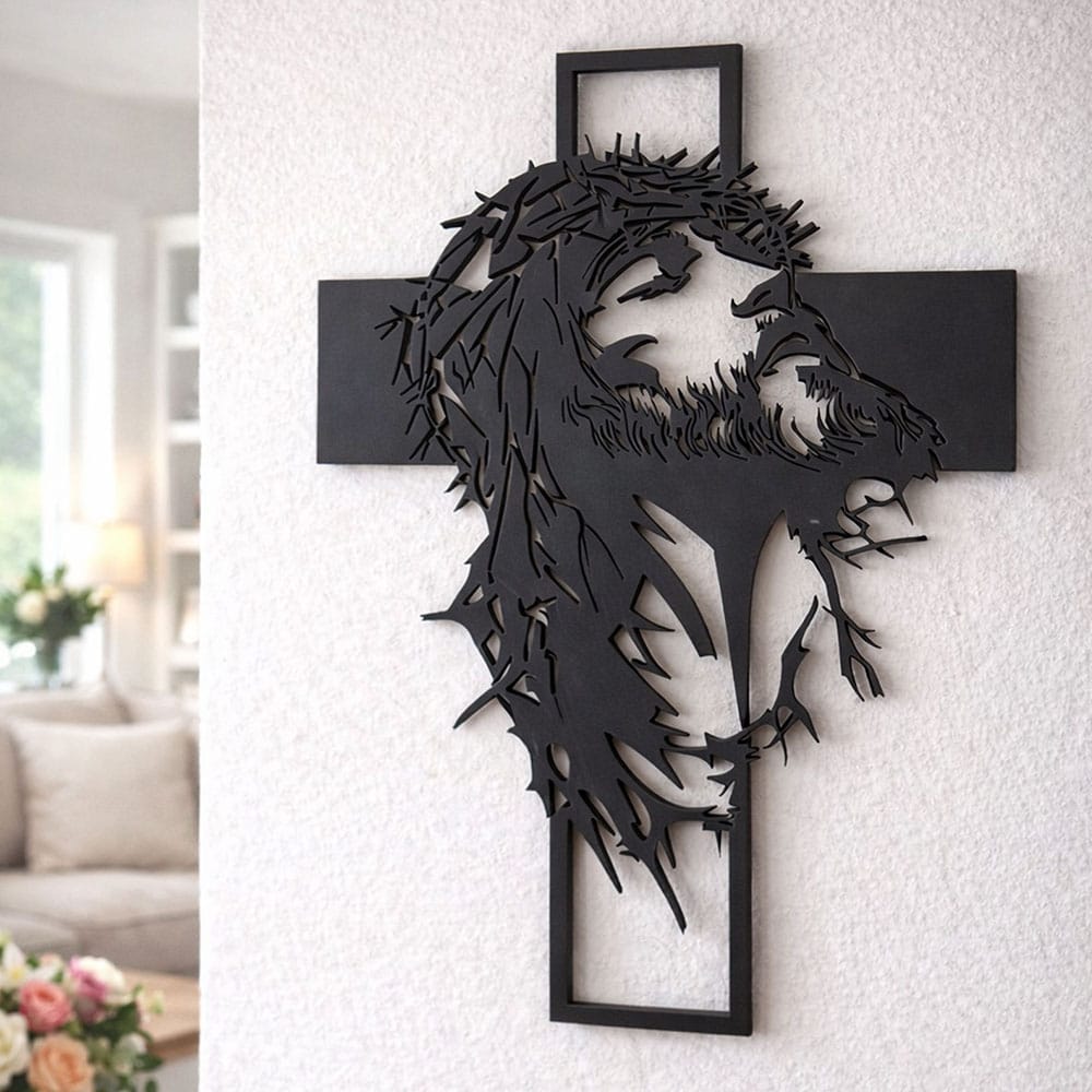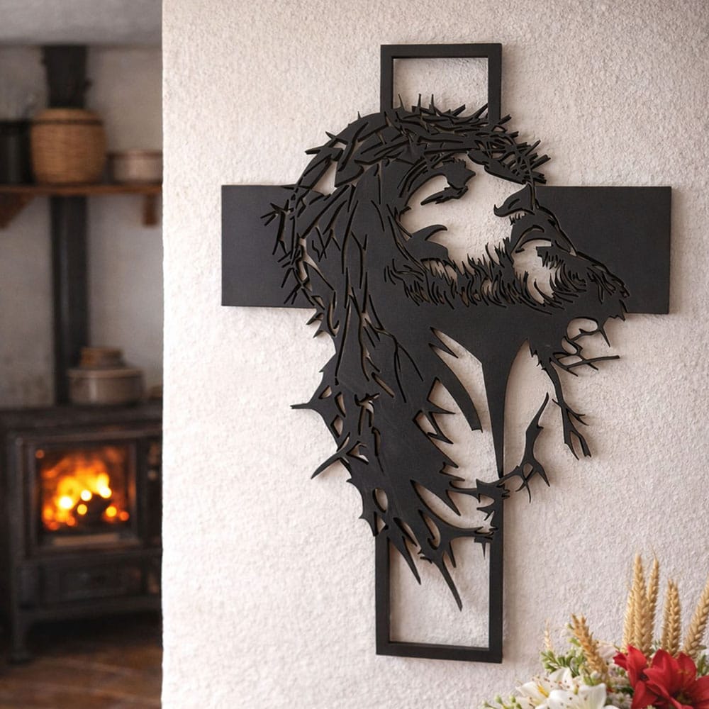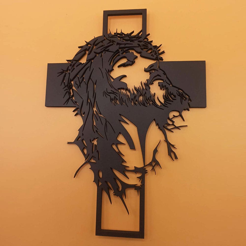 Naš moderni zidni križ s likom Isusa nije samo dekoracija, već snažna umjetnička interpretacija Kristove žrtve i pobjede. Karakterizira ga upečatljiv kontrast i precizna laserska izrada koja naglašava svaki detalj – od dubine pogleda do svake bodlje na kruni od trnja.