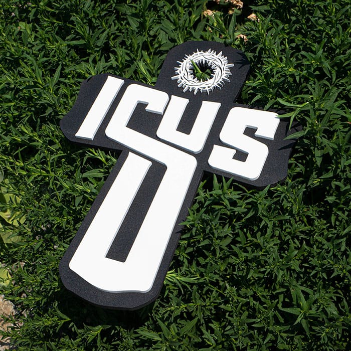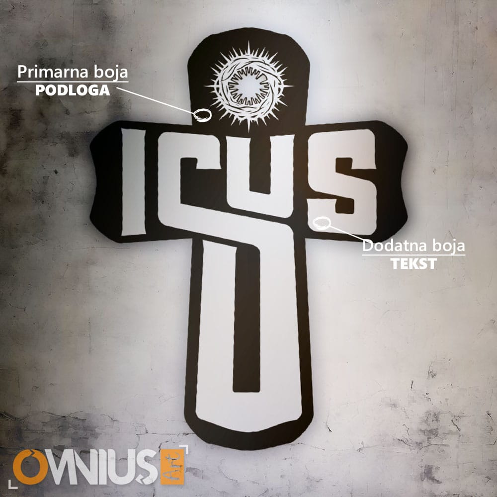 Naš križ s natpisom Isus predstavlja inovativan pristup tradicionalnom simbolu. Umjesto klasičnog oblika, ovaj dizajn koristi stilizirana slova imena Isus kako bi se formirali krakovi križa, stvarajući vizualno snažnu i modernu poruku.